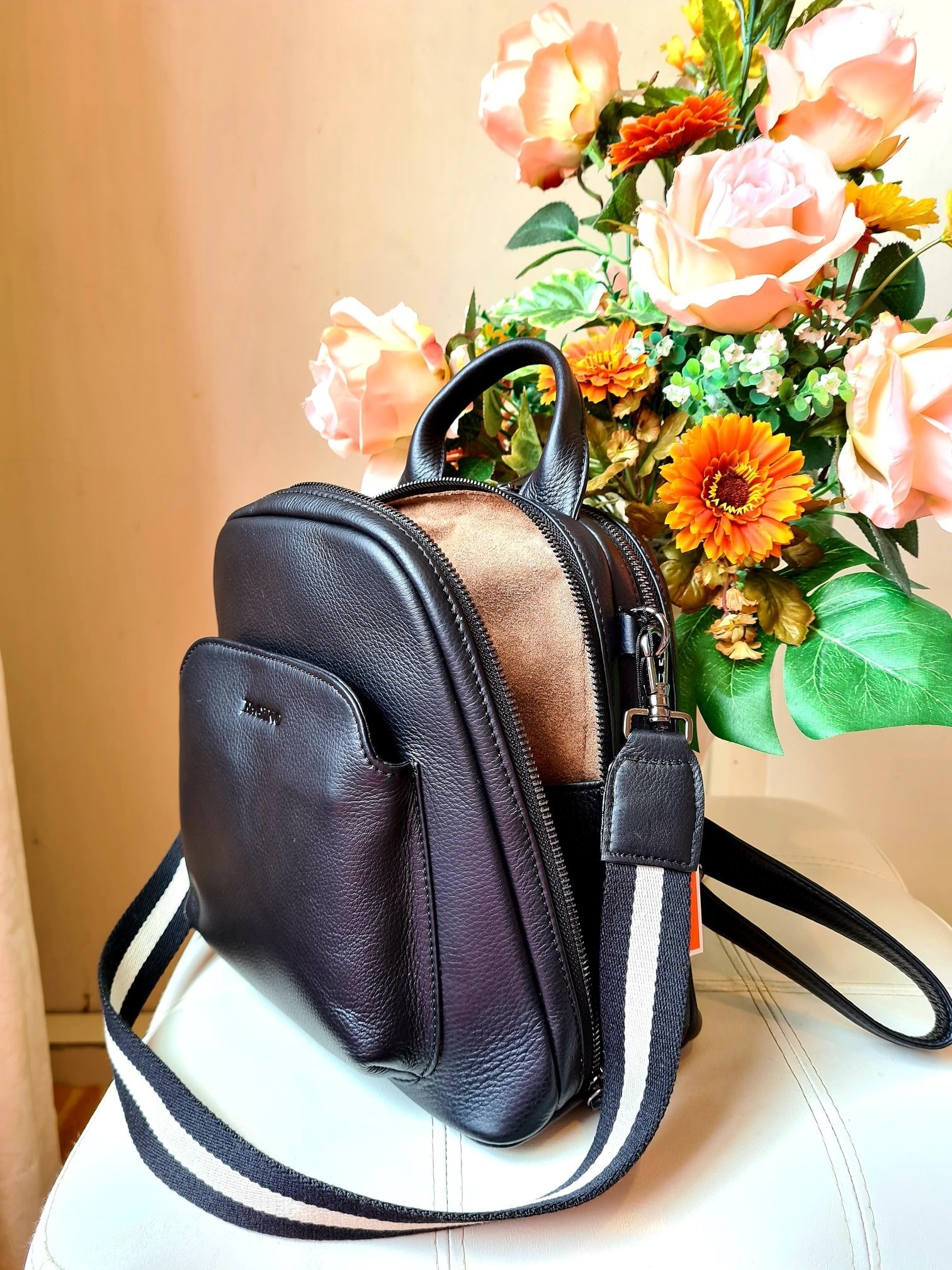 Best bang, genuine leather backpack, 2 zips, comes with a spot strap, very chic, very beautiful, applicable for all genders and ages. Lightweight suede.